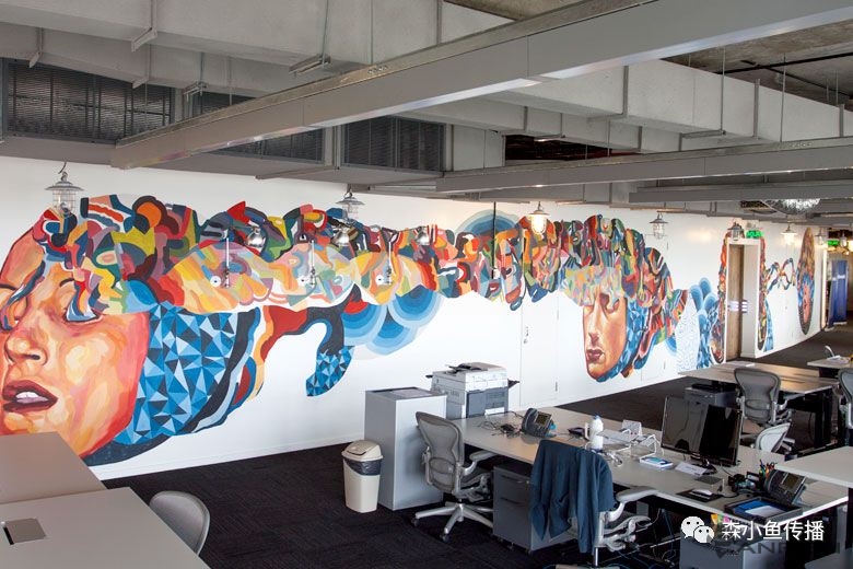 墻面適合表達的,應(yīng)該是相對恒久固定的,相對抽象和偏精神層面的。通過精妙的圖形、簡約的文字、巧妙的裝飾營造恰當(dāng)?shù)姆諊?,讓員工身處其中,感覺到美和舒適的同時,還能和其產(chǎn)生積極的情感連接。比如我們看國外很多互聯(lián)網(wǎng)公司的例子:
